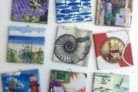 Sličice za zid su kao i ostali naši proizvodi napravljeni od ekološko prihvatljivih materijala, obojeni neškodljivim bojama i prelakirani lakom bez mirisa. Proces izrade svake sličice je pojedinačan i sve se radi ručno. Sličice su dekorativne i na njima se pojavljuju najrazličitiji motivi. Naši klijenti obično kupuju uspomene na svoje posjete našoj obali pa su i najčešći motivi na sličicama morski. To su prizori brodića, najrazličitije ribice, alge, morska plovila, biljke ili životinje tj. sve ono što bi nas moglo asocirati na ugodan boravak.